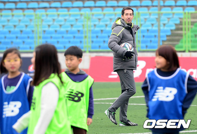 29일 오후 서울 효창운동장에서 열린 서울 이랜드 FC 공개훈련 행사에서 마틴 레니 감독이 어린이 팬들이 공을 차는 모습을 바라보고 있다.
