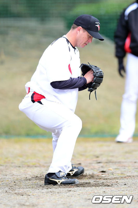 29일 오후 kt위즈의 스프링 캠프가 차려진 일본 미야자키(宮崎)현 휴가(日向)시의 다이오타니 야구장에서 kt위즈 옥스프링이 투구자세를 유지하고 있다.