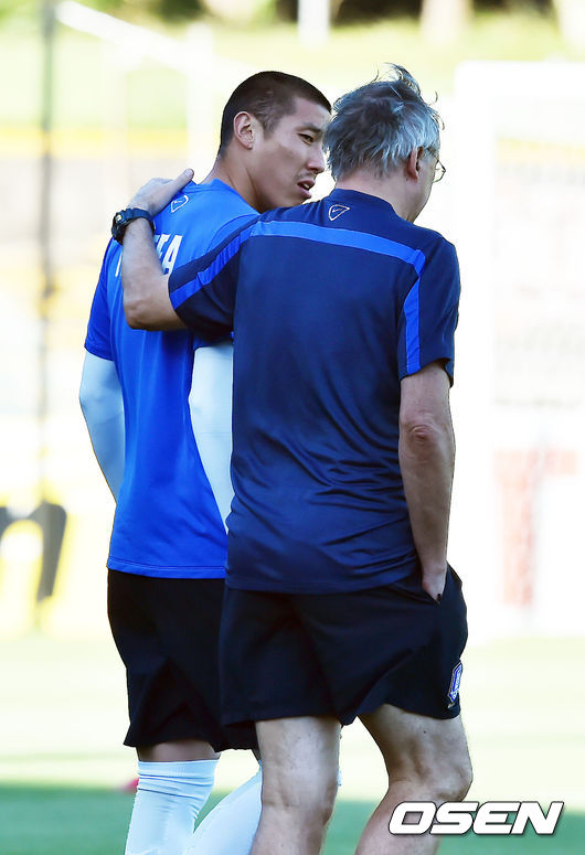 슈틸리케 감독이 차두리를 불러 얘기를 하고 있다.