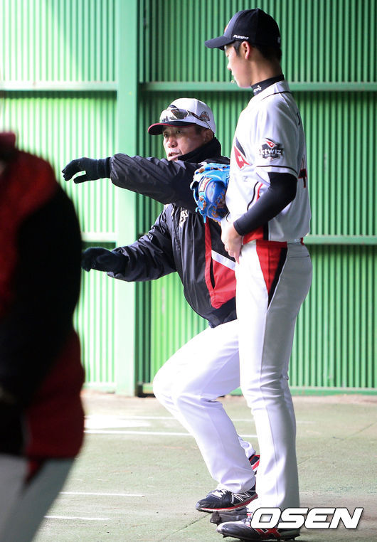 29일 오전 kt위즈의 스프링 캠프가 차려진 일본 미야자키(宮崎)현 휴가(日向)시의 다이오타니 야구장에서 kt위즈 조범현 감독이 이성민을 가르치고 있다.