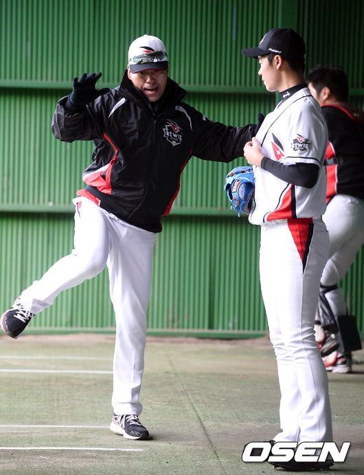 29일 오전 kt위즈의 스프링 캠프가 차려진 일본 미야자키(宮崎)현 휴가(日向)시의 다이오타니 야구장에서 kt위즈 조범현 감독이 이성민의 투구자세를 교정시키고 있다.