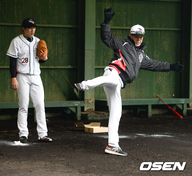 29일 오전 kt위즈의 스프링 캠프가 차려진 일본 미야자키(宮崎)현 휴가(日向)시의 다이오타니 야구장에서 kt위즈 조범현 감독이 장시환의 투구자세를 교정시키고 있다.