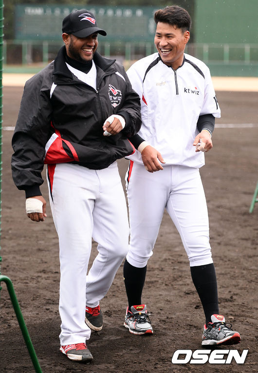 29일 오후 kt위즈의 스프링 캠프가 차려진 일본 미야자키(宮崎)현 휴가(日向)시의 다이오타니 야구장에서 kt위즈 마르테와 김상현이 이야기를 나누며 미소 짓고 있다