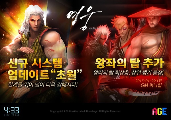 네시삼십삼분(이하 4:33)은 29일, 자사가 서비스하고 썸에이지에서 개발한 모바일 액션 RPG(역할수행게임) '영웅 for Kakao(이하 영웅)'에 초월, 랜덤 진화 등 기존 영웅 캐릭터를 활용할 수 있는 새로운 시스템이 업데이트됐다고 밝혔다.