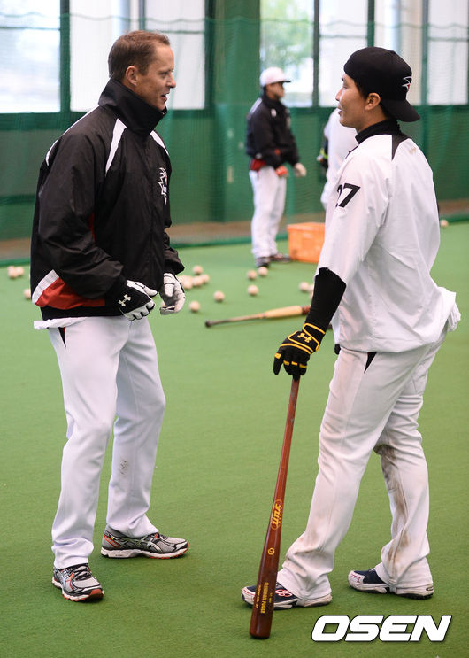 29일 오전 kt위즈의 스프링 캠프가 차려진 일본 미야자키(宮崎)현 휴가(日向)시의 다이오타니 야구장에서 kt위즈 옥스프링과 용덕한이 이야기를 나누고 있다.