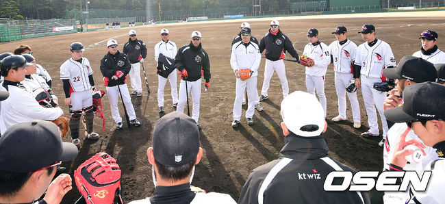 29일 오전 kt위즈의 스프링 캠프가 차려진 일본 미야자키(宮崎)현 휴가(日向)시의 다이오타니 야구장에서 kt위즈 선수들이 미팅을 갖고 있다.