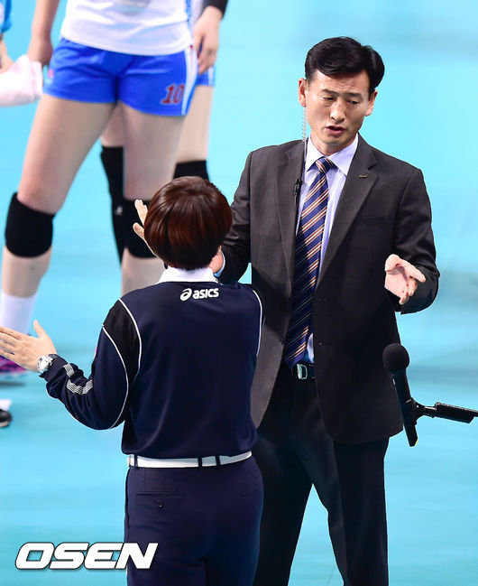29일 오후 서울 장충체육관에서 열린 '2014-2015 프로배구 V리그 여자부' GS칼텍스와 도로공사의 경기, 1세트 도로공사 서남원 감독이 비디오판독을 요청하고 있다.