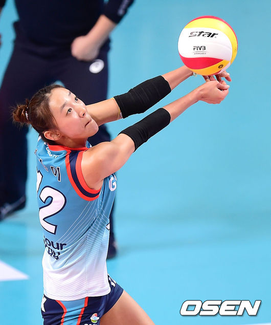 29일 오후 서울 장충체육관에서 열린 '2014-2015 프로배구 V리그 여자부' GS칼텍스와 도로공사의 경기, 1세트 GS 한송이가 리시브를 하고 있다.