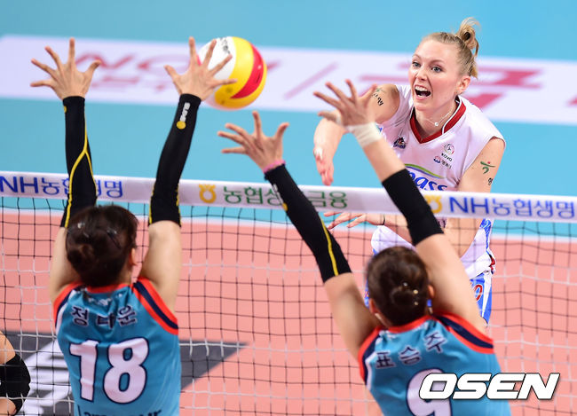 29일 오후 서울 장충체육관에서 열린 '2014-2015 프로배구 V리그 여자부' GS칼텍스와 도로공사의 경기, 1세트 도로공사 니콜이 공격을 시도하고 있다.
