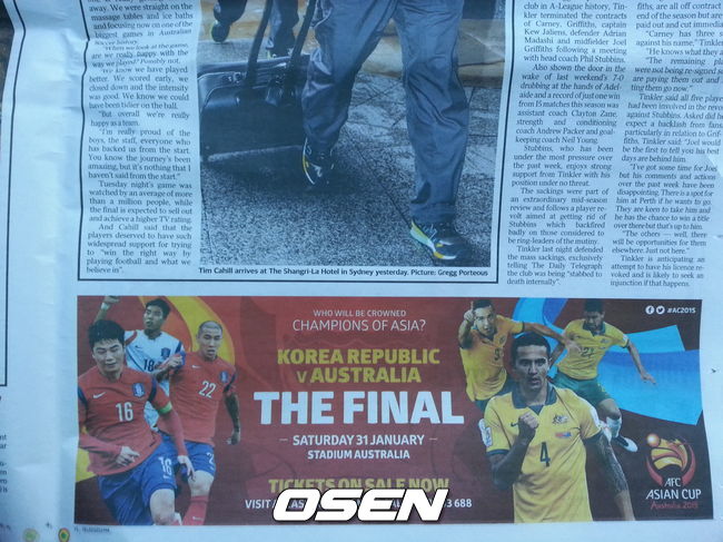 활약이 이쯤 되니 AFC도 결승 무대를 빛낼 주요 선수로 이정협을 꼽지 않을 수 없다. 호주 데일리 텔레그라프는 지난 29일 이정협의 사진이 나와 있는 AFC의 아시안컵 결승 포스터를 한 켠에 실었다. 당초 AFC는 공식 가이드북에 한국의 주요 선수로 손흥민(레버쿠젠)과 기성용(스완지 시티)의 사진을 내건 바 있다. 이정협의 얼굴이 추가됐다. 이 신문에 나와 있는 포스터에는 '캡틴' 기성용과 태극마크를 달고 은퇴경기를 준비하고 있는 차두리(서울)와 함께 이정협의 사진이 당당히 실려 있다.