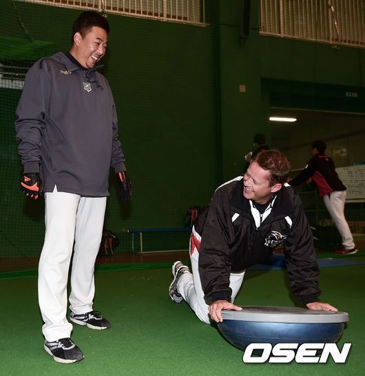 29일 오전 kt위즈의 스프링 캠프가 차려진 일본 미야자키(宮崎)현 휴가(日向)시의 다이오타니 야구장에서 kt위즈 옥스프링과 김사율이 농담을 나누고 있다