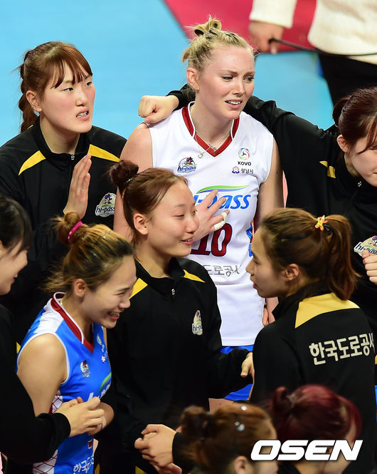 경기종료 후, 승리한 도로공사 선수들이 동료들과 기쁨을 나누고 있다. /ouxou@osen.co.kr