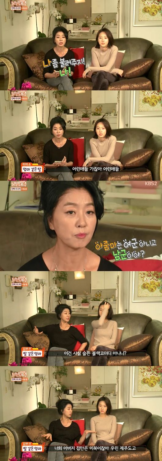 이날 김부선은 ‘진짜 사나이’ 여군 특집을 처음으로 시청한 듯 방송에 집중, “나 좀 불러주지”라고 출연 욕심을 드러냈다. 이에 그의 딸 이미소가 “어린 사람들이 가잖아”라고 설명하자, 김부선은 “아줌마는 여군 아니라 남군이야?”라고 따졌다.
