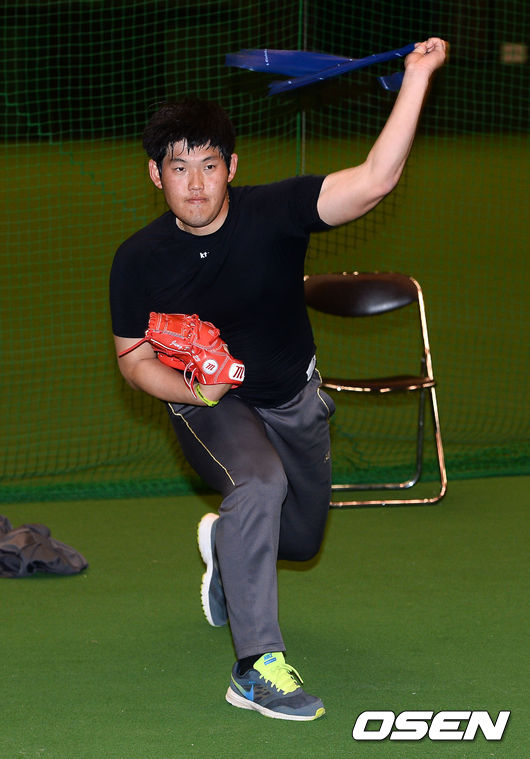 29일 오전 kt위즈의 스프링 캠프가 차려진 일본 미야자키(宮崎)현 휴가(日向)시의 다이오타니 야구장에서 kt위즈 정대현이 섀도피칭을 하고 있다.