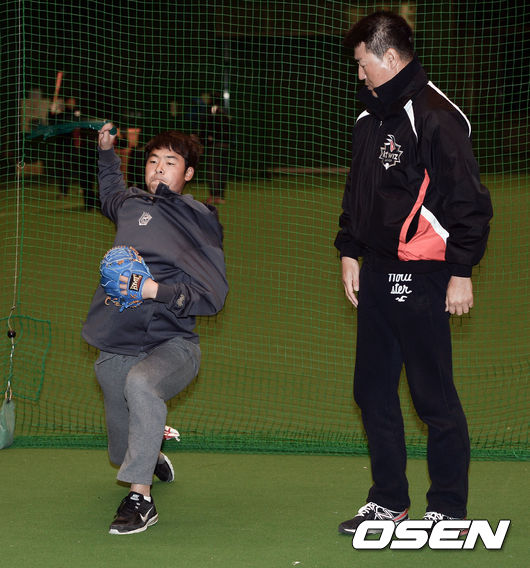 29일 오전 kt위즈의 스프링 캠프가 차려진 일본 미야자키(宮崎)현 휴가(日向)시의 다이오타니 야구장에서 kt위즈 이성민이 정명원 코치 앞에서 섀도 피칭을 하고 있다.