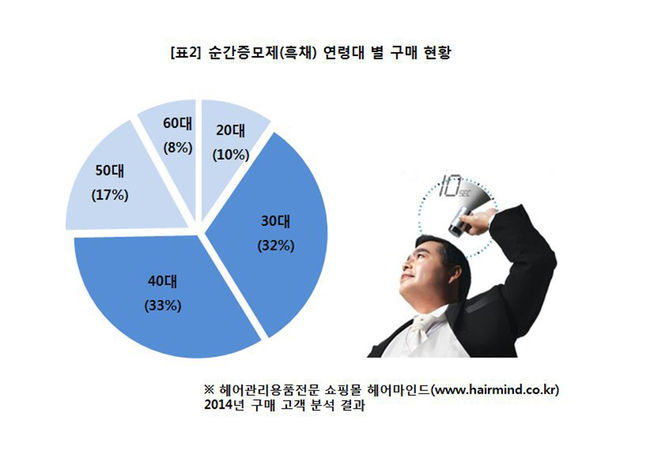 헤어마인드의 순간증모제 '슈퍼밀리언헤어' 구매 현황을 분석한 결과(2014년도 기준) 연령 별로 가장 구매가 많은 세대는 40대(33%)였으며, 아주 근소한 차이로 30대(32%)가 그 뒤를 차지했다. 50대(17.4%), 20대(9.5%), 60대(7.9%)가 그 뒤를 이었다. 이로써 3040세대가 탈모 문제를 해결하고 풍성한 머리 숱을 연출하기 위해 순간증모제 제품을 가장 많이 구매하는 세대인 것으로 나타났다.