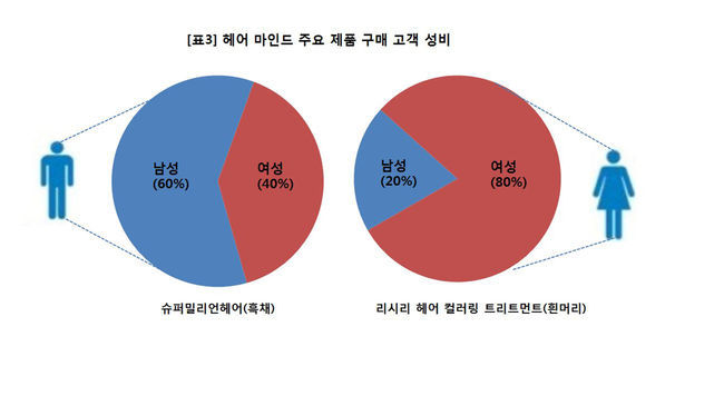 헤어마인드의 흰머리 전용 헤어 컬러링 트리트먼트인 리시리 제품의 경우는 반대로 남성 대(對) 여성의 비중이 2:8로 여성이 훨씬 많은 것으로 나타났다.