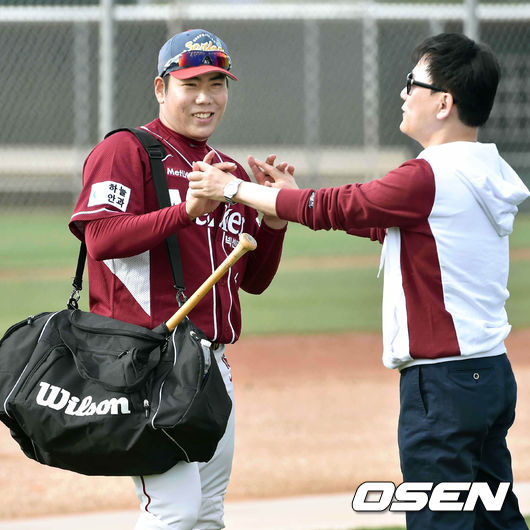 이날 캠프를 방문한 이장석 대표가 강정호와 장난을 치고 있다./spjj@osen.co.kr
