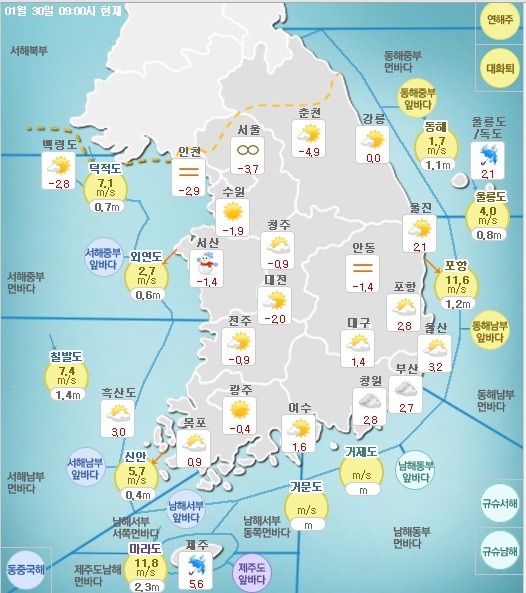 30일은 중국 북부지방에 위치한 고기압의 영향을 점차 받겠으나, 남부지방은 기압골의 영향을 받다가 벗어나겠다. 전국이 가끔 구름많다가 낮에 점차 맑아지겠으나, 남부지방과 제주도는 흐린 후 오후에 개겠다. 한편, 중부 일부내륙에는 아침까지, 충청이남서해안은 아침부터 낮 사이에 산발적으로 눈이 날리는 곳이 있겠다.