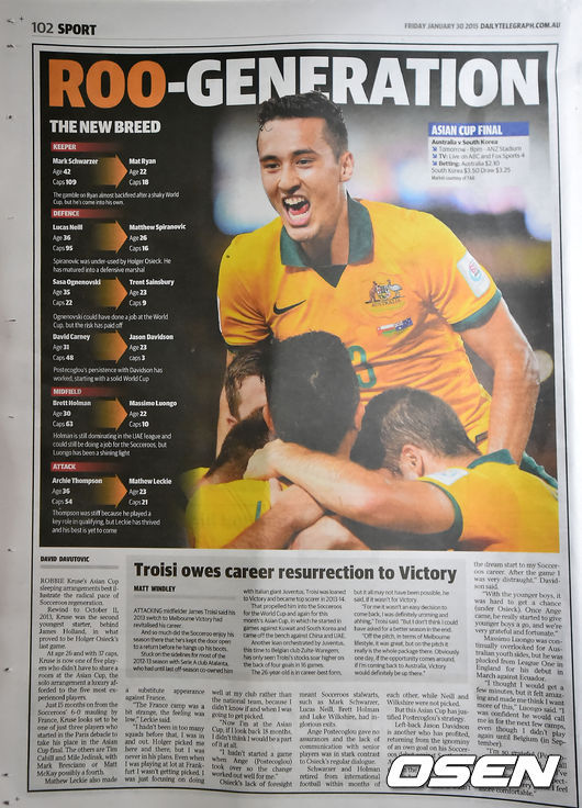 호주 데일리 텔레그라프는 30일 '루-제너레이션'이라는 제하의 기사를 축구 섹션 탑으로 내걸었다. 마크 슈워처(43, 레스터시티), 루카스 닐(37, 오미야), 사샤 오그네노브스키(36, 시드니 FC), 데이빗 카르니(32, 뉴욕 레드불스), 브렛 홀맨(31, 아스톤 빌라), 아치 톰프슨(37, 멜버른 빅토리) 등 노장들의 시대가 가고 매트 라이언(23, 클럽 브뤼헤), 매슈 스피라노비치(27, 웨스턴 시드니), 트렌트 세인즈버리(24, 즈볼러), 제이슨 데이비슨(24, 웨스트브로미치), 마시오 루옹고(23, 스윈든타운), 매튜 레키(24, 잉골슈타트) 등 뉴 제너레이션의 도래를 주목했다.