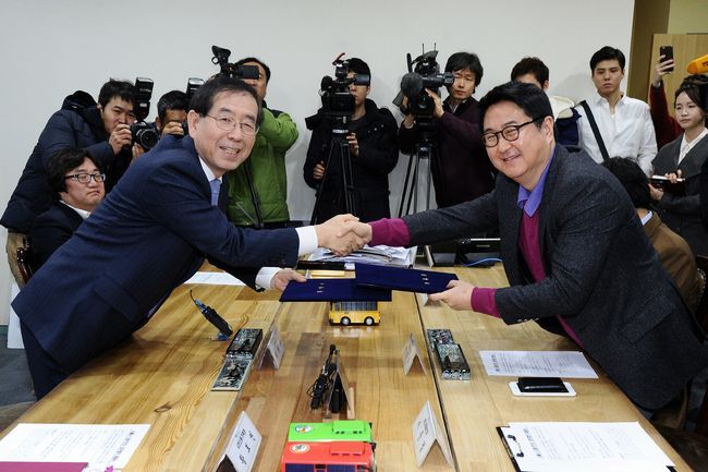 서울시는 “다음카카오와 손잡고 폭설‧수해‧지진 등 각종 재난에 대비한 실시간 정보 공유 플랫폼을 구축한다”고 밝히고 30일 오전 10시20분 시장집무실에서 ‘안전한 서울 구축을 위한 서울특별시-다음카카오 상호 업무 협약’을 체결했다. 업무 협약식에는 박원순 시장과 이석우 다음카카오 대표가 참석해 협약서에 서명했다.