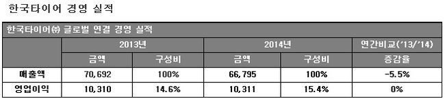 한국타이어의 2014년 매출이 전년도 대비 소폭 감소했으나, 신차용 타이어 공급 확대로 영업이익은 전년 수준을 유지한 것으로 나타났다.
