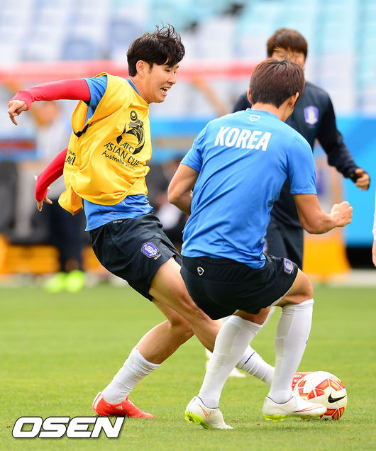 울리 슈틸리케 감독이 이끄는 한국 축구대표팀과 호주대표팀이 30일(이하 한국시간) 호주 시드니에 위치한 스타디움 오스트레일리아서 2015 AFC 아시안컵 결승전 기자회견 및 훈련을 가졌다. 한국 손흥민이 한교원과 볼 다툼을 하고 있다.