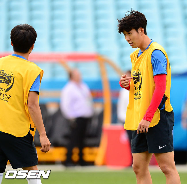 울리 슈틸리케 감독이 이끄는 한국 축구대표팀과 호주대표팀이 30일(이하 한국시간) 호주 시드니에 위치한 스타디움 오스트레일리아서 2015 AFC 아시안컵 결승전 기자회견 및 훈련을 가졌다. 한국 손흥민이 김진수와 얘기를 나누고 있다.