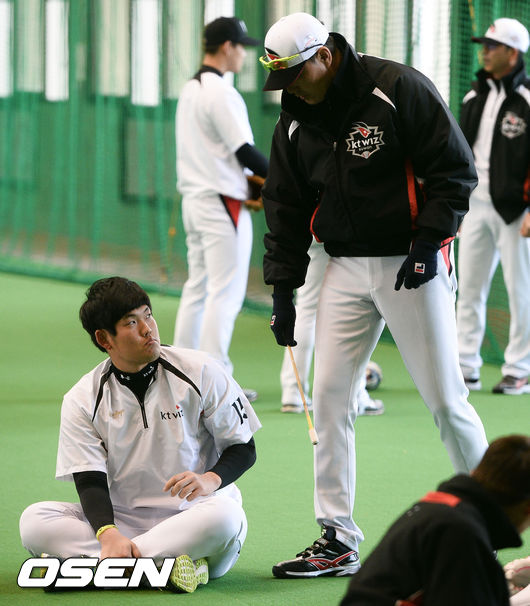 30일 kt위즈의 스프링 캠프가 차려진 일본 미야자키(宮崎)현 휴가(日向)시의 다이오타니 야구장 실내연습장에서 kt위즈 정대현이 정명원 코치의 지적에 삐친 표정을 짓고 있다.