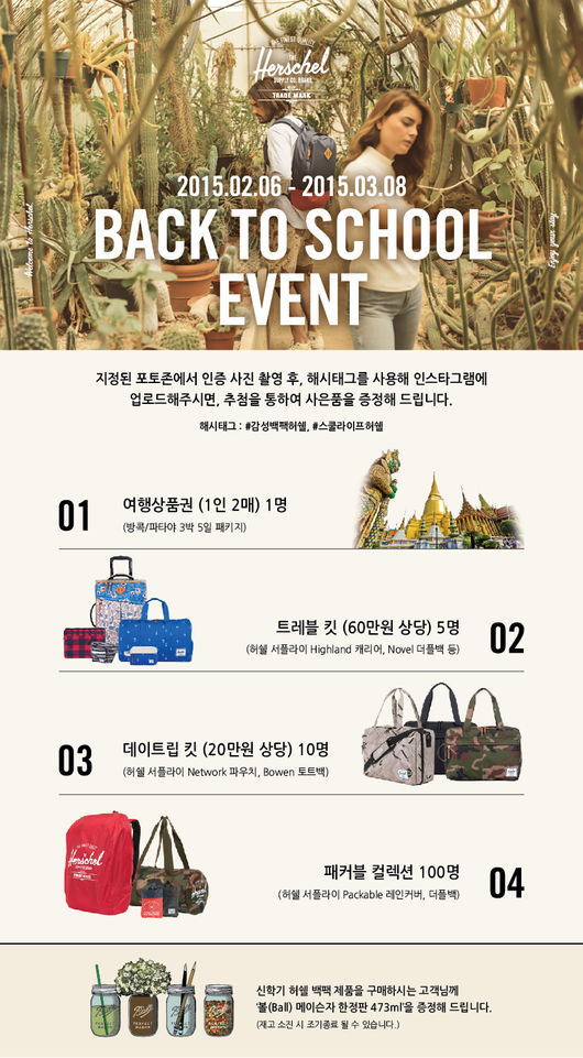 허쉘 서플라이에서는 신학기를 맞아 인스타그램 이벤트를 진행한다. 지정된 오프라인 스토어 포토존에서 인증 사진을 촬영한 후, #감성백팩허쉘 #스쿨라이프허쉘 등의 해시태그를 이용해 인스타그램에 업로드 하면 해외 여행상품권, 허쉘 트레블 킷 등 다양한 경품을 제공할 예정이다.