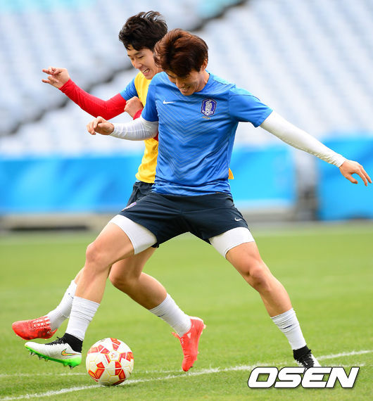 울리 슈틸리케 감독이 이끄는 한국 축구대표팀과 호주대표팀이 30일(이하 한국시간) 호주 시드니에 위치한 스타디움 오스트레일리아서 2015 AFC 아시안컵 결승전 기자회견 및 훈련을 가졌다. 한국 손흥민과 장현수가 미니게임을 하고 있다.