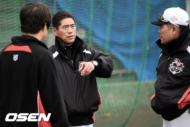 30일 kt위즈의 스프링 캠프가 차려진 일본 미야자키(宮崎)현 휴가(日向)시의 다이오타니 야구장 실내연습장에서 kt위즈 조범현 감독이 훈련에 앞서 이광근 수석코치, 주장 신명철과 이야기를 나누고 있다.