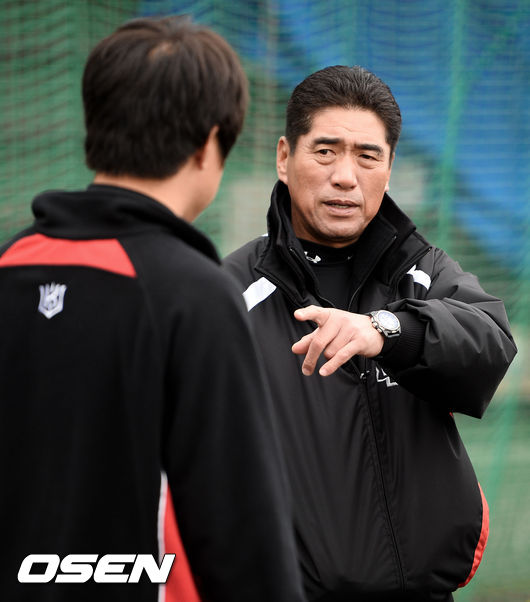30일 kt위즈의 스프링 캠프가 차려진 일본 미야자키(宮崎)현 휴가(日向)시의 다이오타니 야구장에서 kt위즈 조범현 감독이 훈련에 앞서 신명철과 이야기를 하고 있다.