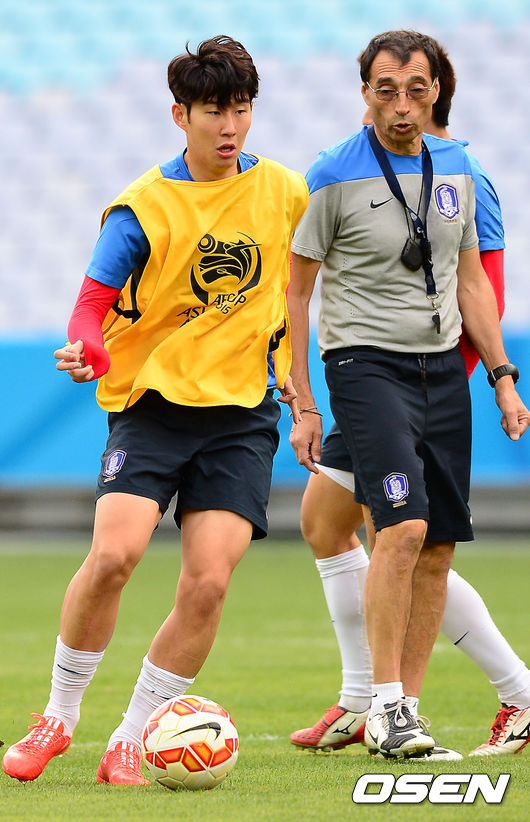울리 슈틸리케 감독이 이끄는 한국 축구대표팀과 호주대표팀이 30일(이하 한국시간) 호주 시드니에 위치한 스타디움 오스트레일리아서 2015 AFC 아시안컵 결승전 기자회견 및 훈련을 가졌다. 한국 손흥민이 미니게임을 할때 아르모아 코치가 이를 바라보고 있다.