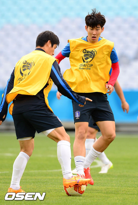 울리 슈틸리케 감독이 이끄는 한국 축구대표팀과 호주대표팀이 30일(이하 한국시간) 호주 시드니에 위치한 스타디움 오스트레일리아서 2015 AFC 아시안컵 결승전 기자회견 및 훈련을 가졌다. 한국 손흥민과 이근호가 볼 다툼을 하고 있다.