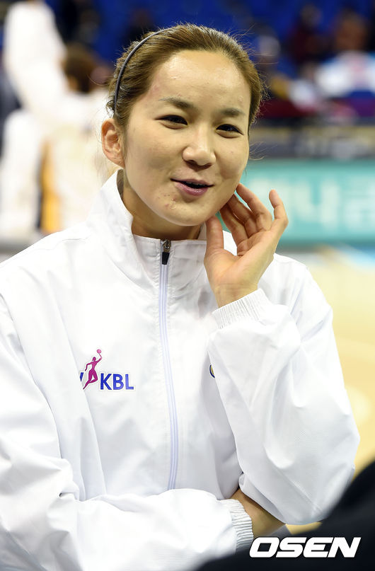 30일 오후 경기도 부천시 부천실내체육관에서 열린 'KB국민은행 2014-2015 여자프로농구' 하나외환과 신한은행의 경기에 앞서 신한은행으로 트레이드 된 신정자가 취재진과 인터뷰를 하고 있다.