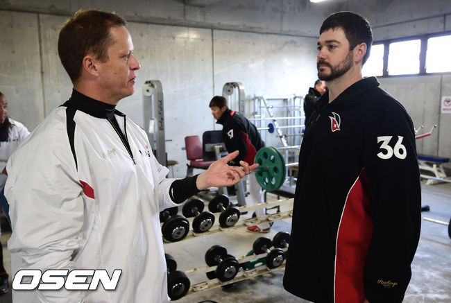 30일 kt위즈의 스프링 캠프가 차려진 일본 미야자키(宮崎)현 휴가(日向)시의 다이오타니 야구장에서 kt위즈 옥스프링과 필 어윈이 이야기를 나누고 있다.