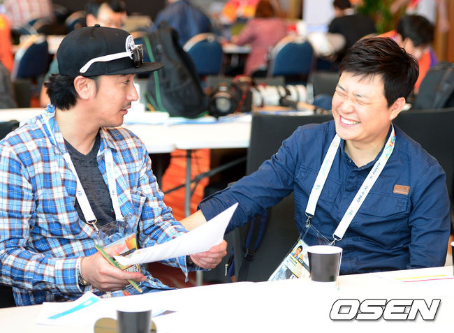울리 슈틸리케 감독이 이끄는 한국 축구대표팀과 호주대표팀이 30일(이하 한국시간) 호주 시드니에 위치한 스타디움 오스트레일리아서 2015 AFC 아시안컵 결승전 기자회견 및 훈련을 가졌다. 기자실에서 안정환 해설위원과 김성주 해설위원이 즐겁게 얘기를 나누고 있다.