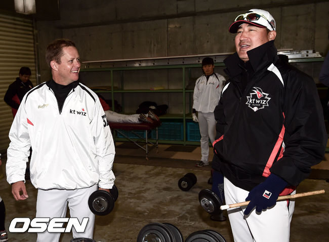 30일 kt위즈의 스프링 캠프가 차려진 일본 미야자키(宮崎)현 휴가(日向)시의 다이오타니 야구장에서 kt위즈 옥스프링과 정명원 코치가 이야기를 나누고 있다.