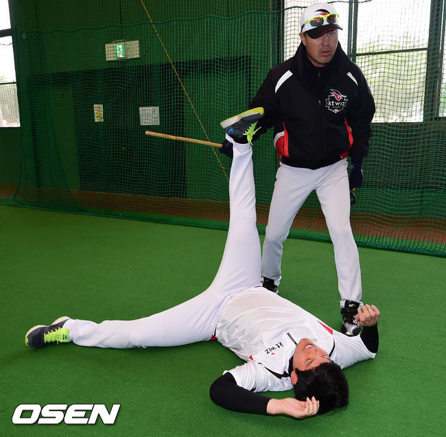 30일 kt위즈의 스프링 캠프가 차려진 일본 미야자키(宮崎)현 휴가(日向)시의 다이오타니 야구장에서 kt위즈 정명원 투수코치가 훈련으로 힘들어하는 정대현의 다리를 풀어주고 있다.