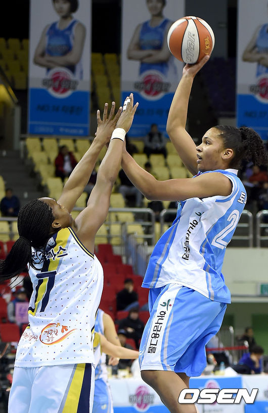 30일 오후 경기도 부천시 부천실내체육관에서 열린 'KB국민은행 2014-2015 여자프로농구' 하나외환과 신한은행의 경기, 1쿼터 하나외환 토마스가 슛을 시도하고 있다.