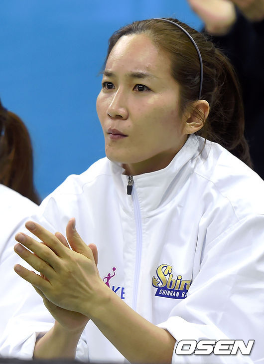 30일 오후 경기도 부천시 부천실내체육관에서 열린 'KB국민은행 2014-2015 여자프로농구' 하나외환과 신한은행의 경기, 1쿼터 신한은행 신정자가 벤치에 앉아 동료들을 응원하고 있다.