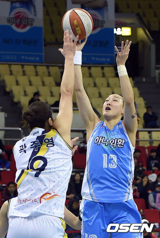 30일 오후 경기도 부천시 부천실내체육관에서 열린 'KB국민은행 2014-2015 여자프로농구' 하나외환과 신한은행의 경기, 1쿼터 하나외환 김정은이 슛을 시도하고 있다.