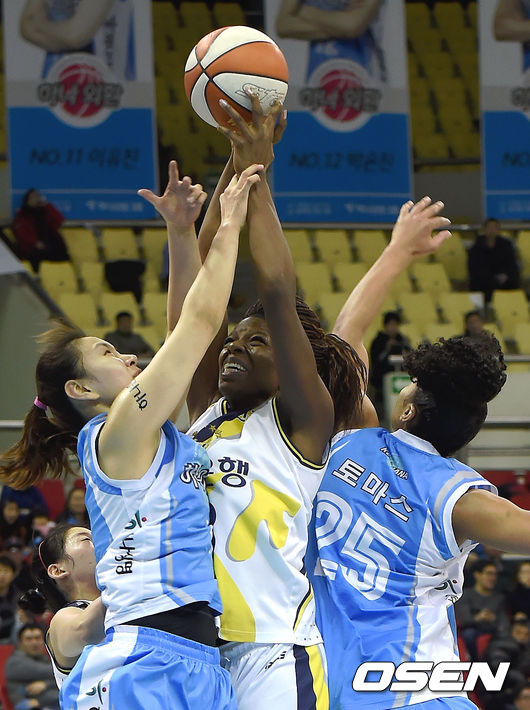 30일 오후 경기도 부천시 부천실내체육관에서 열린 'KB국민은행 2014-2015 여자프로농구' 하나외환과 신한은행의 경기, 1쿼터 신한은행 샌포드가 하나외환 김정은, 토마스와 리바운드 다툼을 벌이고 있다.