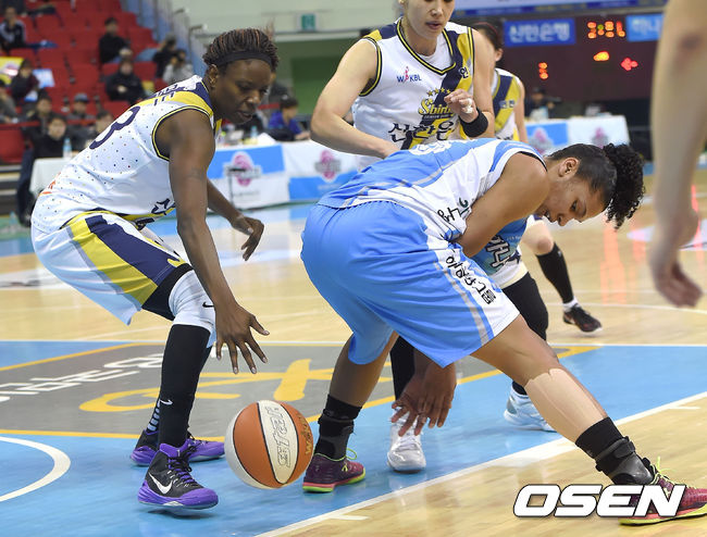 30일 오후 경기도 부천시 부천실내체육관에서 열린 'KB국민은행 2014-2015 여자프로농구' 하나외환과 신한은행의 경기, 1쿼터 하나외완 토마스가 신한은행 샌포드의 수비로 인해 공을 놓치고 있다.