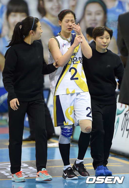 30일 오후 경기도 부천시 부천실내체육관에서 열린 'KB국민은행 2014-2015 여자프로농구' 하나외환과 신한은행의 경기, 3쿼터 신한은행 김규희가 부상으로 교체되고 있다.