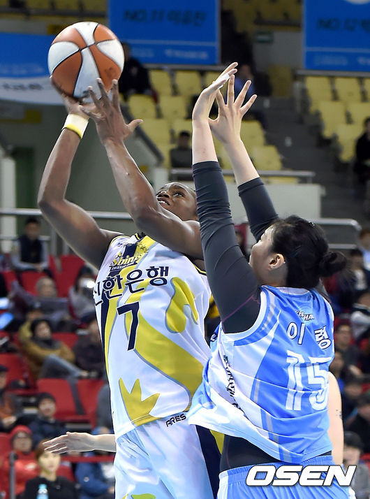 30일 오후 경기도 부천시 부천실내체육관에서 열린 'KB국민은행 2014-2015 여자프로농구' 하나외환과 신한은행의 경기, 3쿼터 신한은행 크리스마스가 슛을 시도하고 있다.
