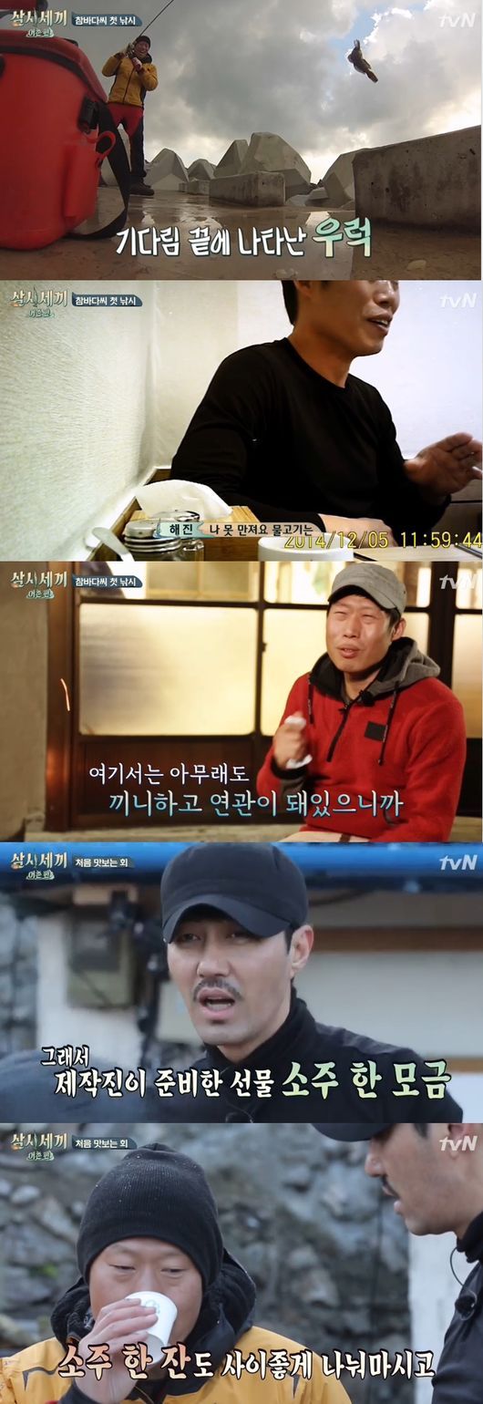 유해진의 우럭 낚시로 사흘 만에 제대로 된 첫 끼를 하는 유해진과 차승원. 유해진은 “감격스럽다”고 말했고, 기쁜 나 PD는 소주 한모금을 선물하는 자축했다.