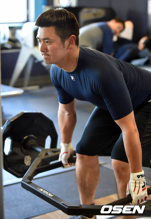 내리는 비로 각 구단은 실내 훈련과 웨이트로 훈련을 대신했다. 최주환이 웨이트 트레이닝을 하고 있다./spjj@osen.co.kr