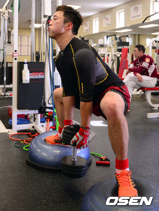 내리는 비로 각 구단은 실내 훈련과 웨이트로 훈련을 대신했다. 넥센 문성현이 웨이트 트레이닝을 하고 있다./spjj@osen.co.kr